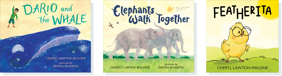 Cheryl is the author of DARIO AND THE WHALE (2016), ELEPHANTS WALK TOGETHER (2017), and FEATHERITA (2024)